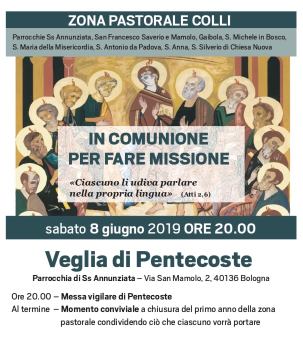 La nostra zona pastorale Colli si riunisce alle ore 20 presso la Chiesa della SS.Annunziata, in questa bella messa vigiliare di Pentecoste per pregare insieme e chiedere il dono dello Spirito, che infiamma, unifica, e ci invia a tutti.